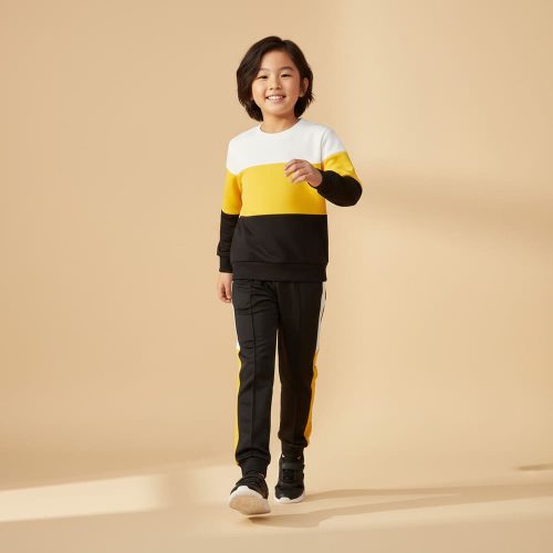 Black colorblock hoodie with “CALIFORNIA” graphic, red hood, yellow & green sleeves + matching black joggers with striped sides — sporty, bold outfit for boys.Black colorblock hoodie with “CALIFORNIA” graphic, red hood, yellow & green sleeves + matching black joggers with striped sides — sporty, bold outfit for boys.