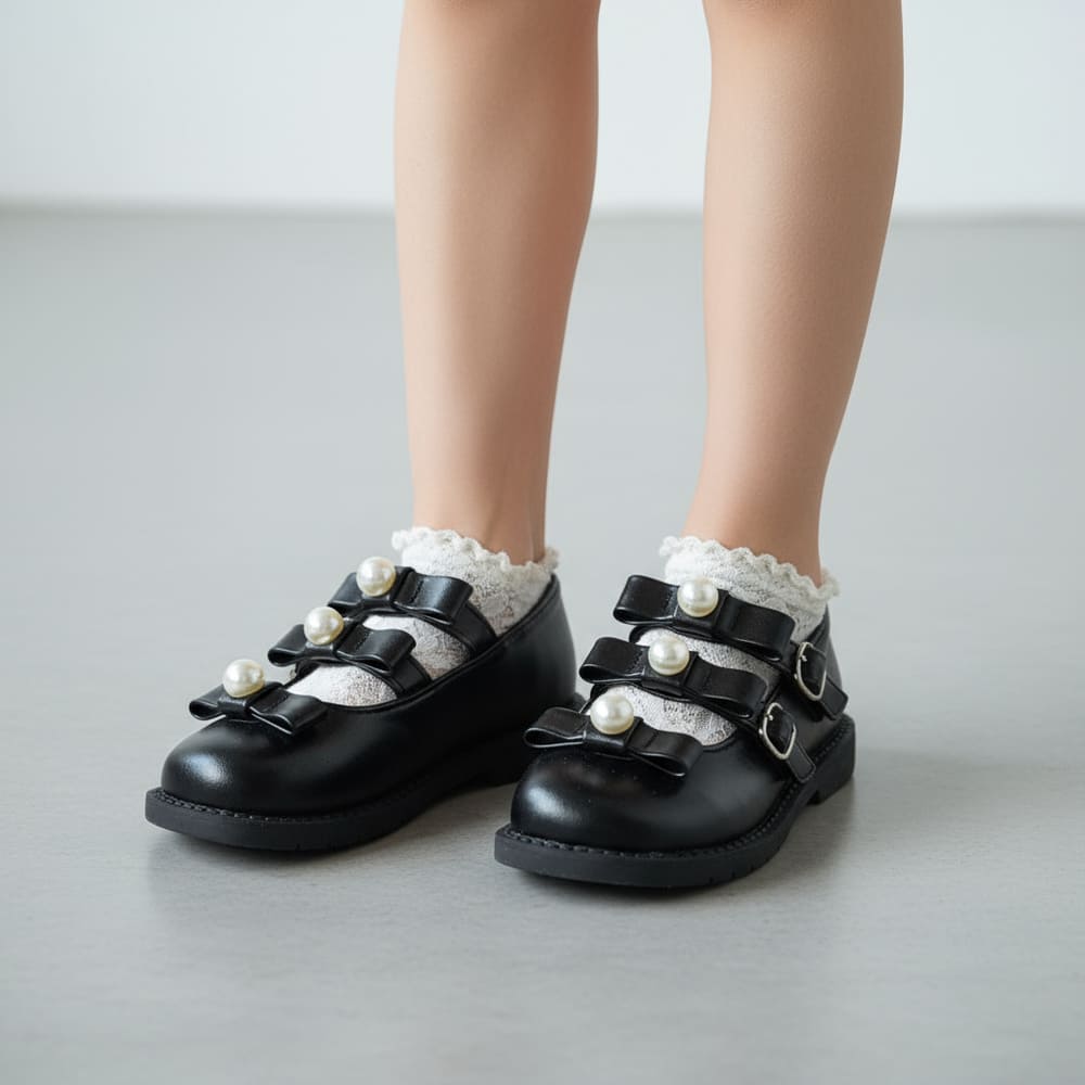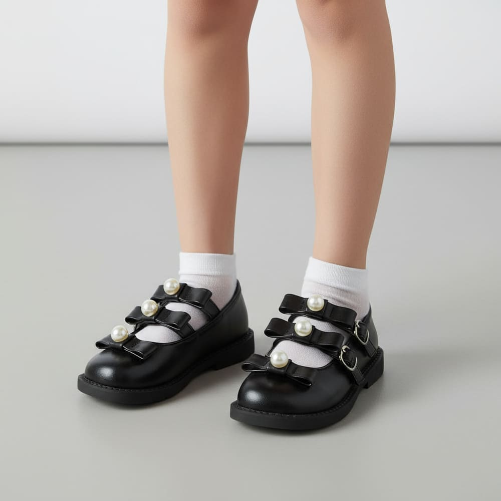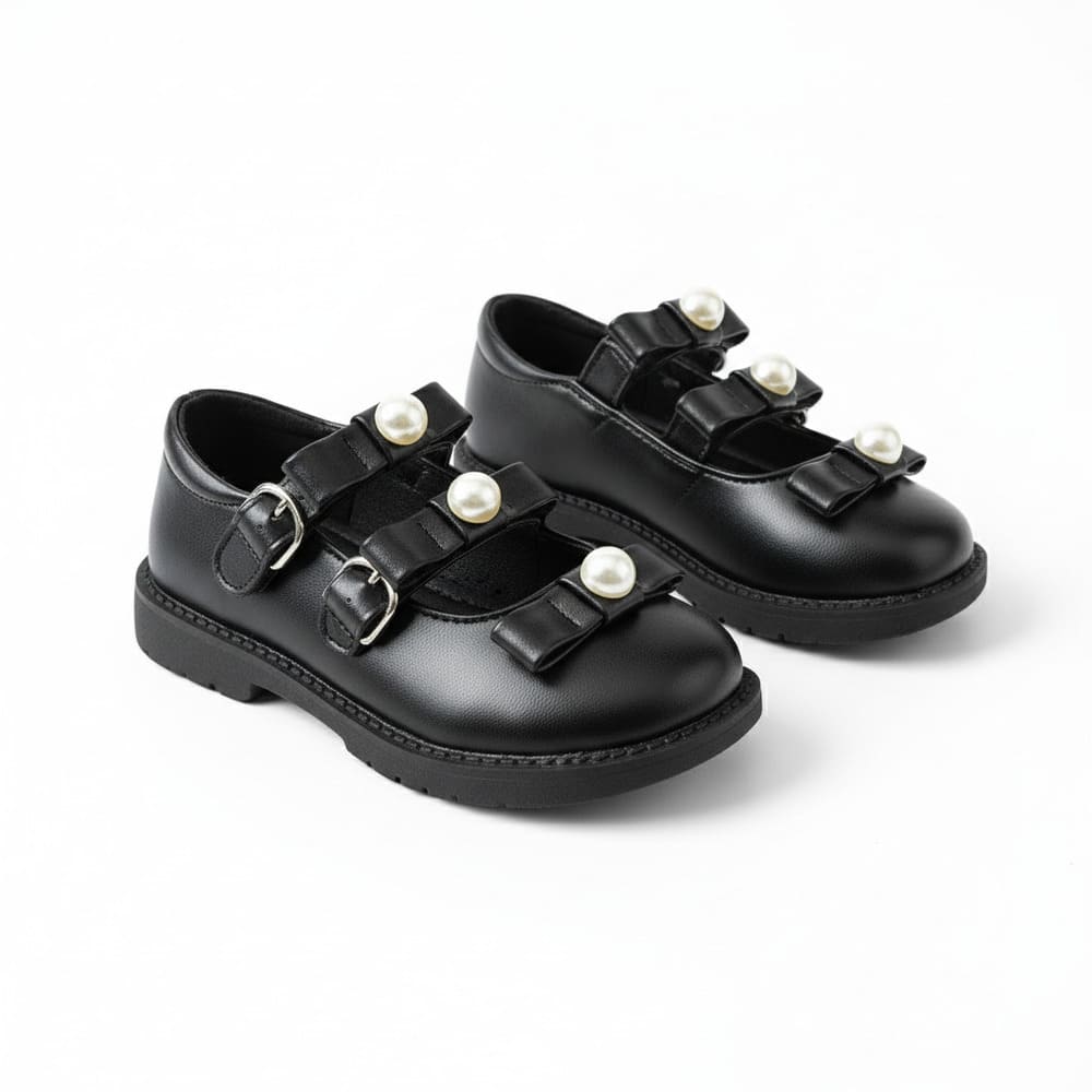 Sleek black Mary Janes with double strap and pearl embellishments. Polished, minimalist, and perfect for school or formal occasions.