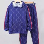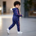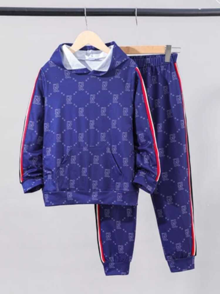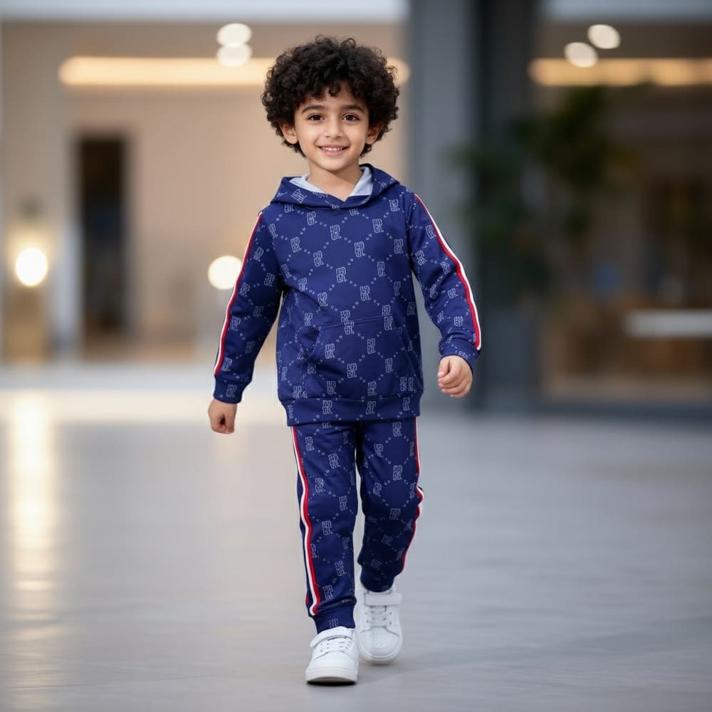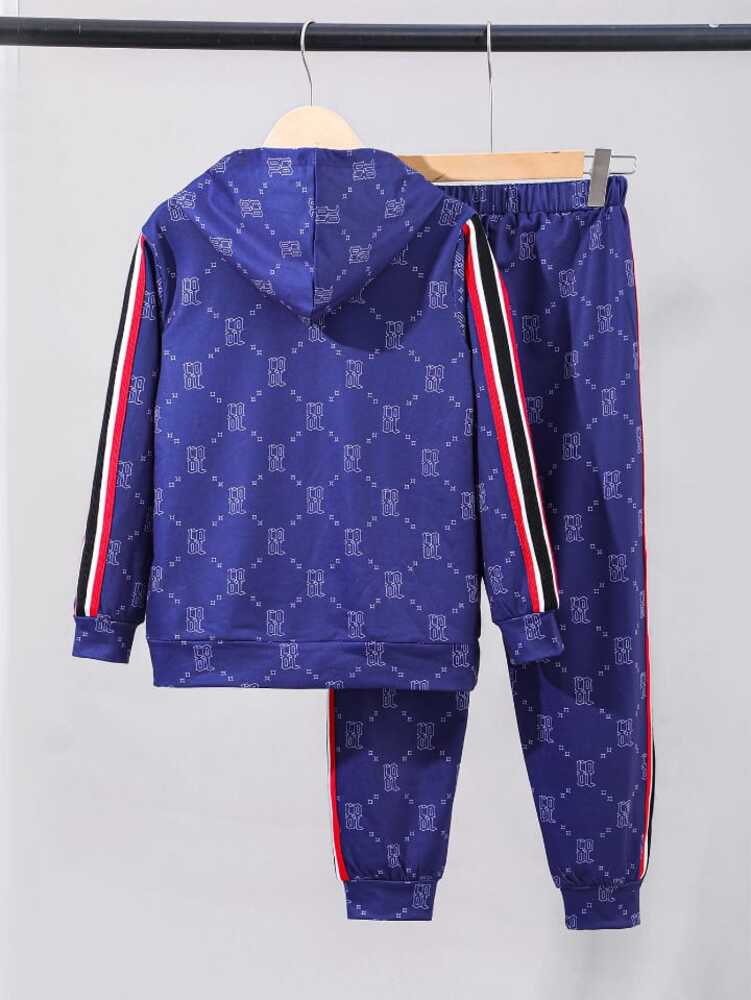 Navy blue hoodie with repeating monogram print + matching joggers with side stripes. Stylish, preppy, and perfect for school or casual outings.