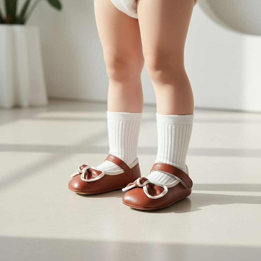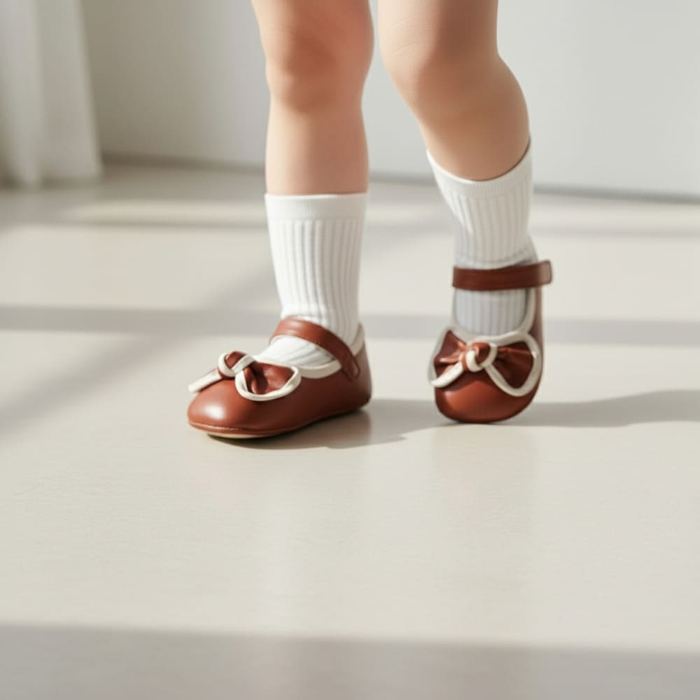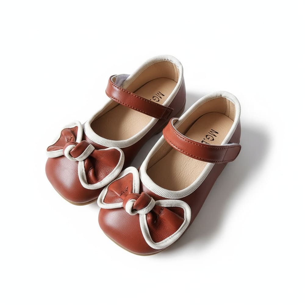 Girl’s brown Mary Jane shoes with white trim and large bow
