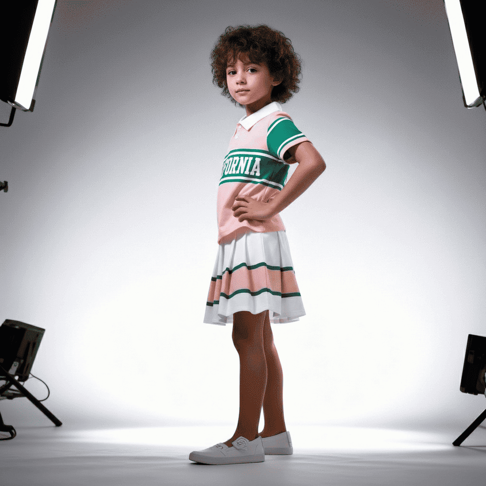 Pink and green “California” polo shirt with matching white pleated skirt and shorts — fun, summery outfit for girls.