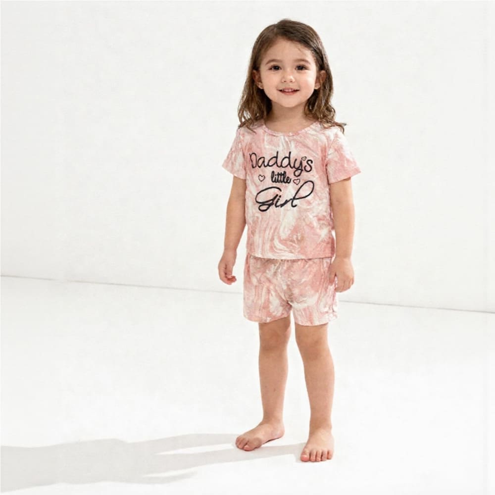 Celebrate daddy-daughter love with this adorable tie-dye set. The soft pink-and-white top features a bold “Daddy’s little Girl” script with heart accents, while matching shorts offer comfort with an elastic waistband. Designed for girls who love sweet moments and stylish comfort. Made from soft cotton-blend fabric for all-day ease. Machine wash cold.