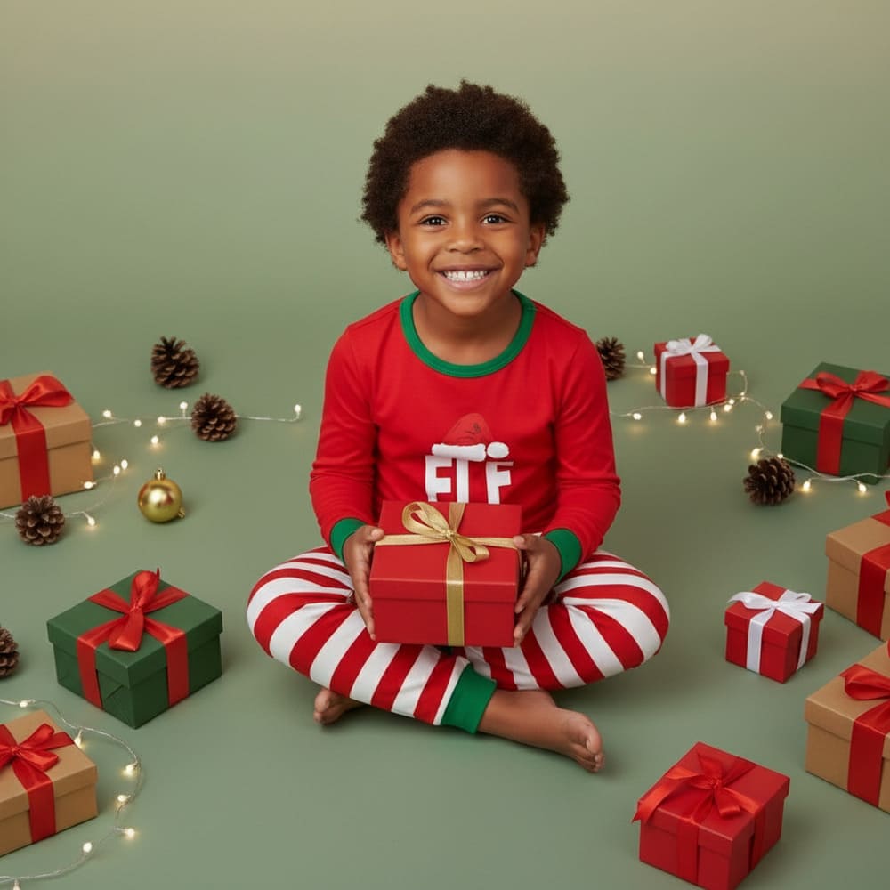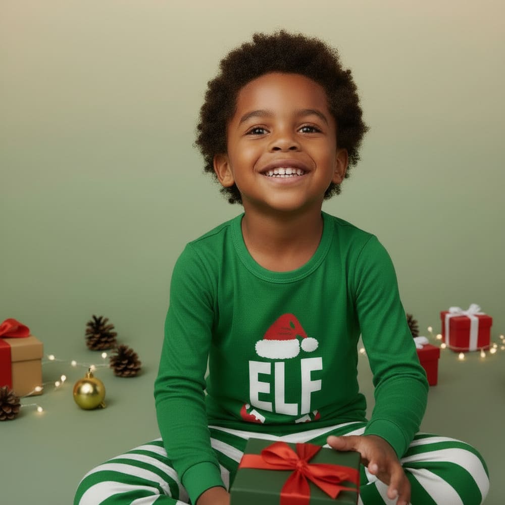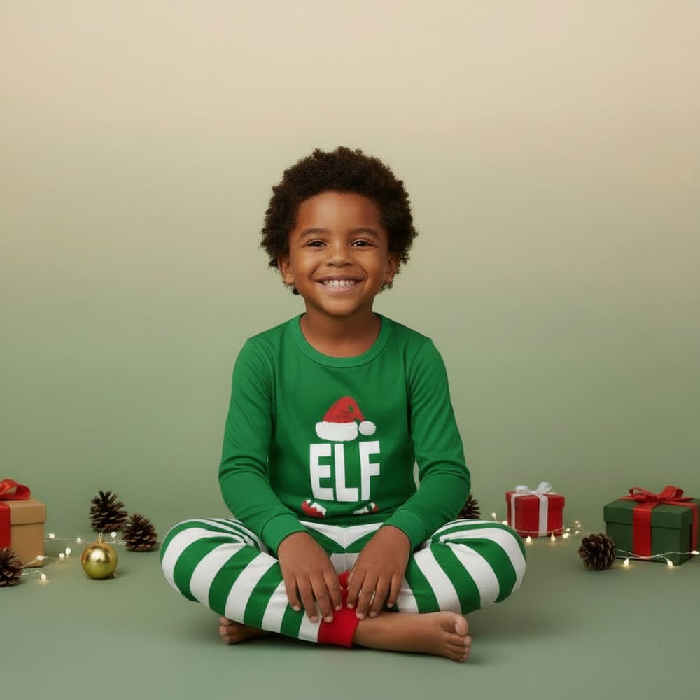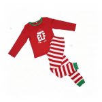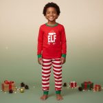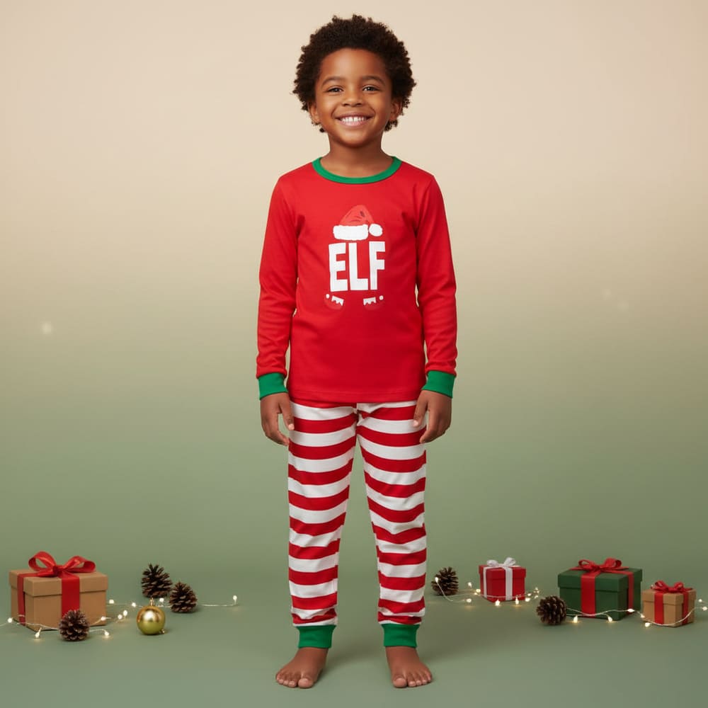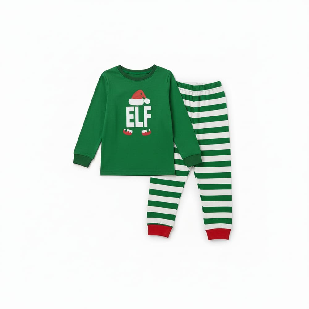 Red long-sleeve top with “ELF” print + red-and-white striped pants. Festive, cozy, and perfect for Christmas celebrations.