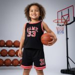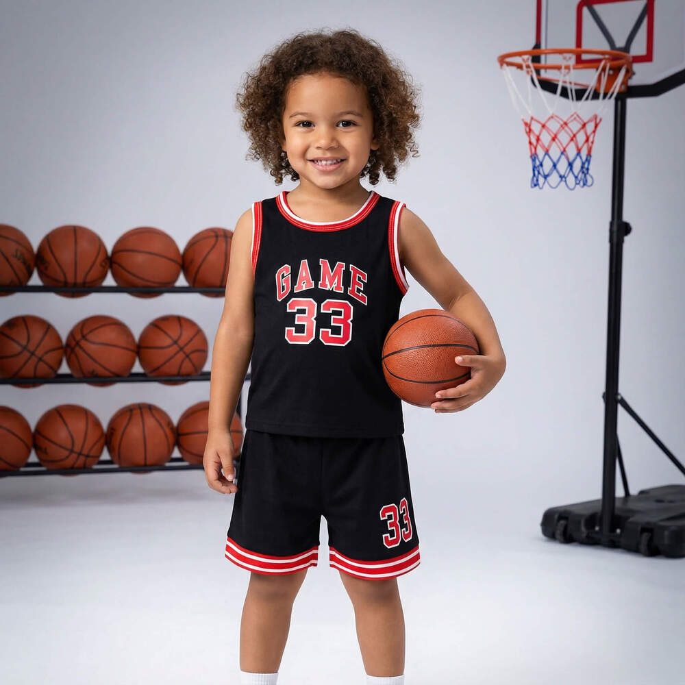 Black kids’ basketball tank top and shorts set with “GAME 33” in red and white — sporty, athletic outfit for active boys.