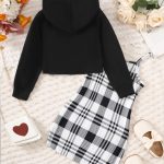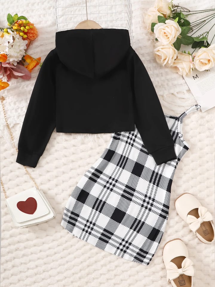 Black cropped hoodie with plaid heart print + matching black-and-white plaid slip dress. Sweet, trendy, and perfect for casual outings.