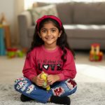 Pink long-sleeve top with “It’s all about the LOVE” print + blue denim-style leggings with sequin patches. Sweet, edgy, and perfect for confident girls.