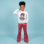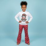 White hoodie with festive girl graphic + red holiday pants with reindeer and trees. Cheerful, cozy, and perfect for Christmas celebrations.