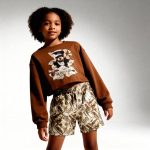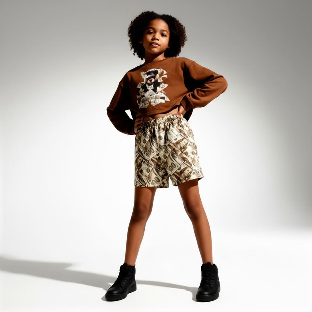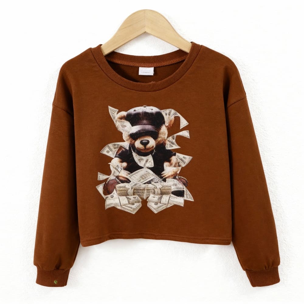 Brown long-sleeve top with bear-in-money graphic + matching money-print pants. Playful, bold, and perfect for imaginative boys.