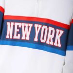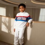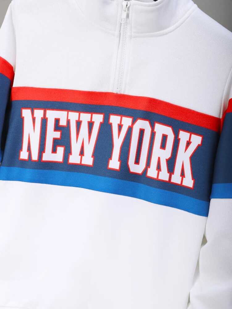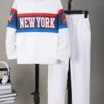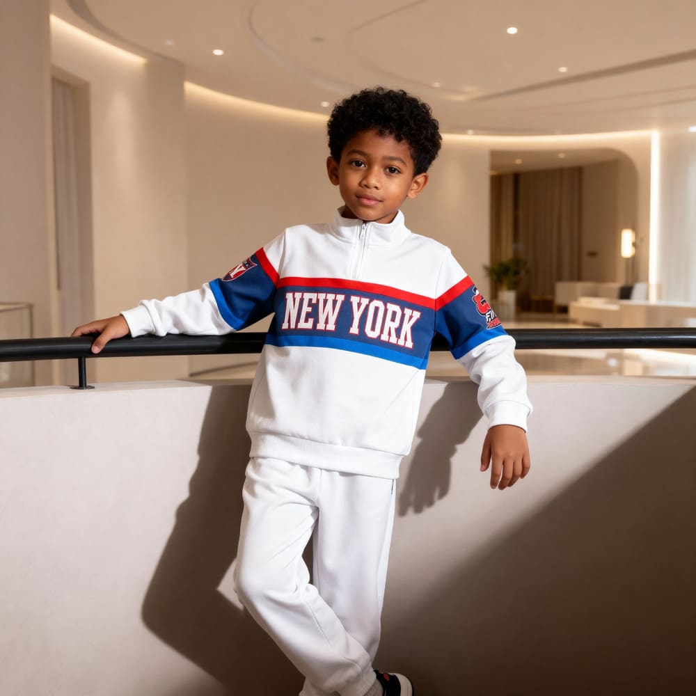 White quarter-zip top with red/blue “NEW YORK” band + matching white joggers. Sporty, urban, and perfect for active kids.