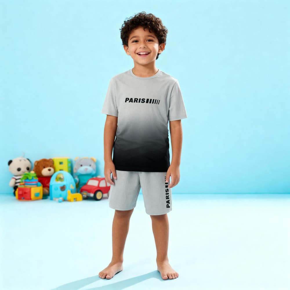 Boy in gray-black gradient “PARIS” tee and matching shorts