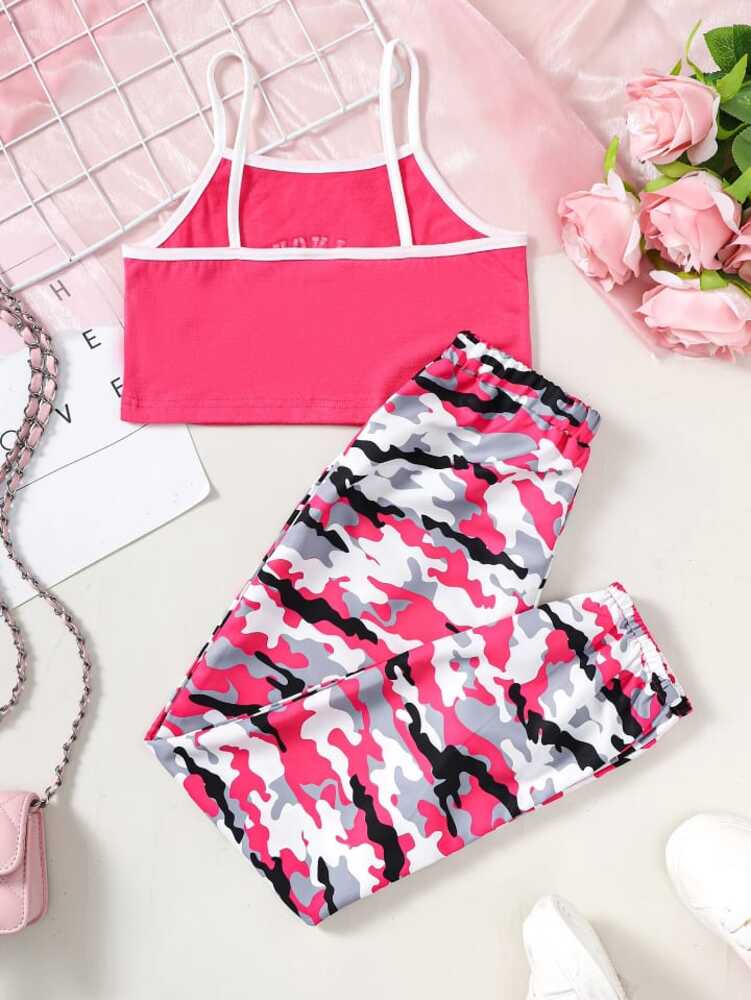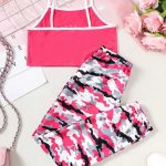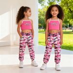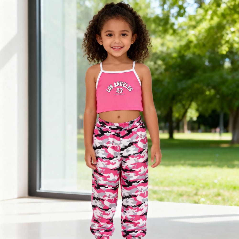 Pink camo-print joggers + matching pink crop top with “Los Angeles 23” print. Sporty, trendy, and perfect for active girls.