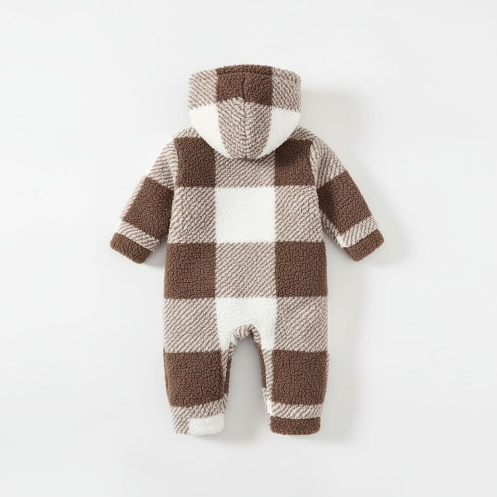 Cozy Brown & White Plaid Hooded Baby Onesie – Soft Fleece, Warm & Adorable for Winter