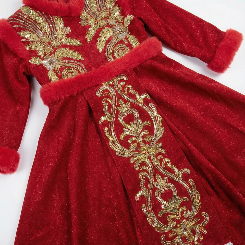 Rich red velvet dress with gold embroidery + faux fur trim. Luxurious, festive, and perfect for Christmas or New Year’s celebrations.