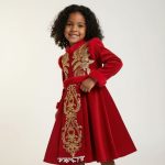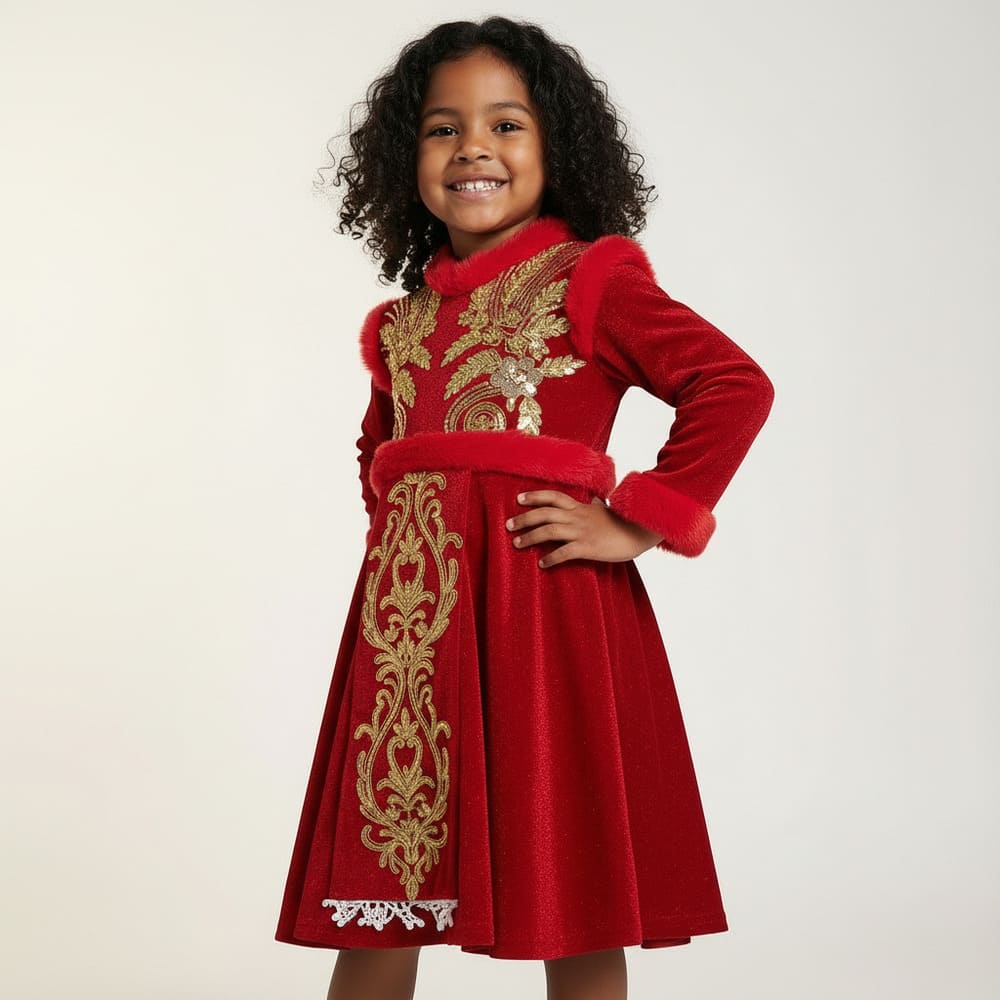 Shine bright with this luxurious holiday dress. The rich red velvet is adorned with intricate gold embroidery across the bodice and skirt, finished with plush faux fur trim at the collar, cuffs, and waist. Designed for girls who love opulent, photo-ready looks. Made from soft velvet for comfort during family gatherings or school events. Machine wash cold.