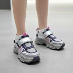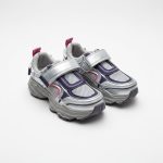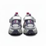 Silver low-top sneakers with pink and purple accents and velcro straps. Trendy, sporty, and perfect for active kids.