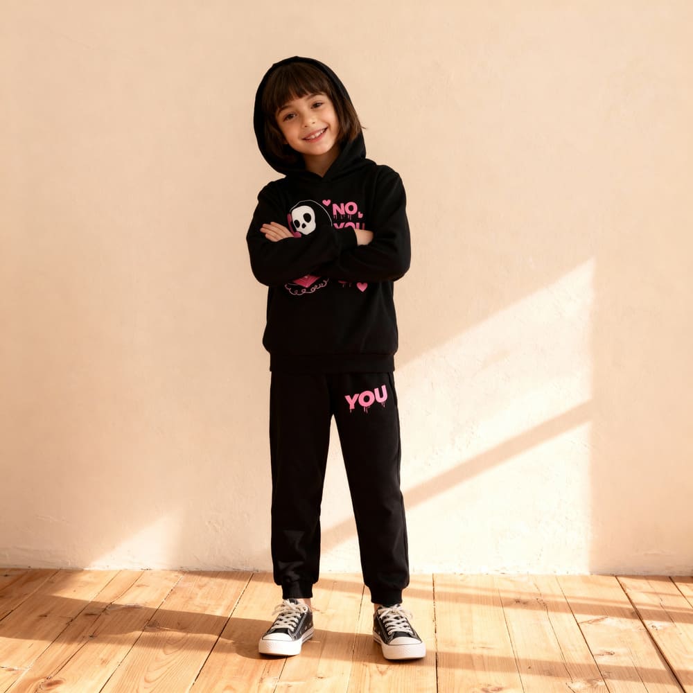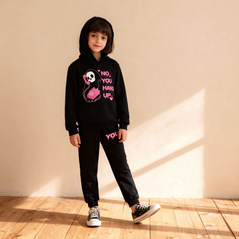 Black hoodie with pink skull + “No You Hang Up” print + matching black joggers. Edgy, playful, and perfect for expressive boys.