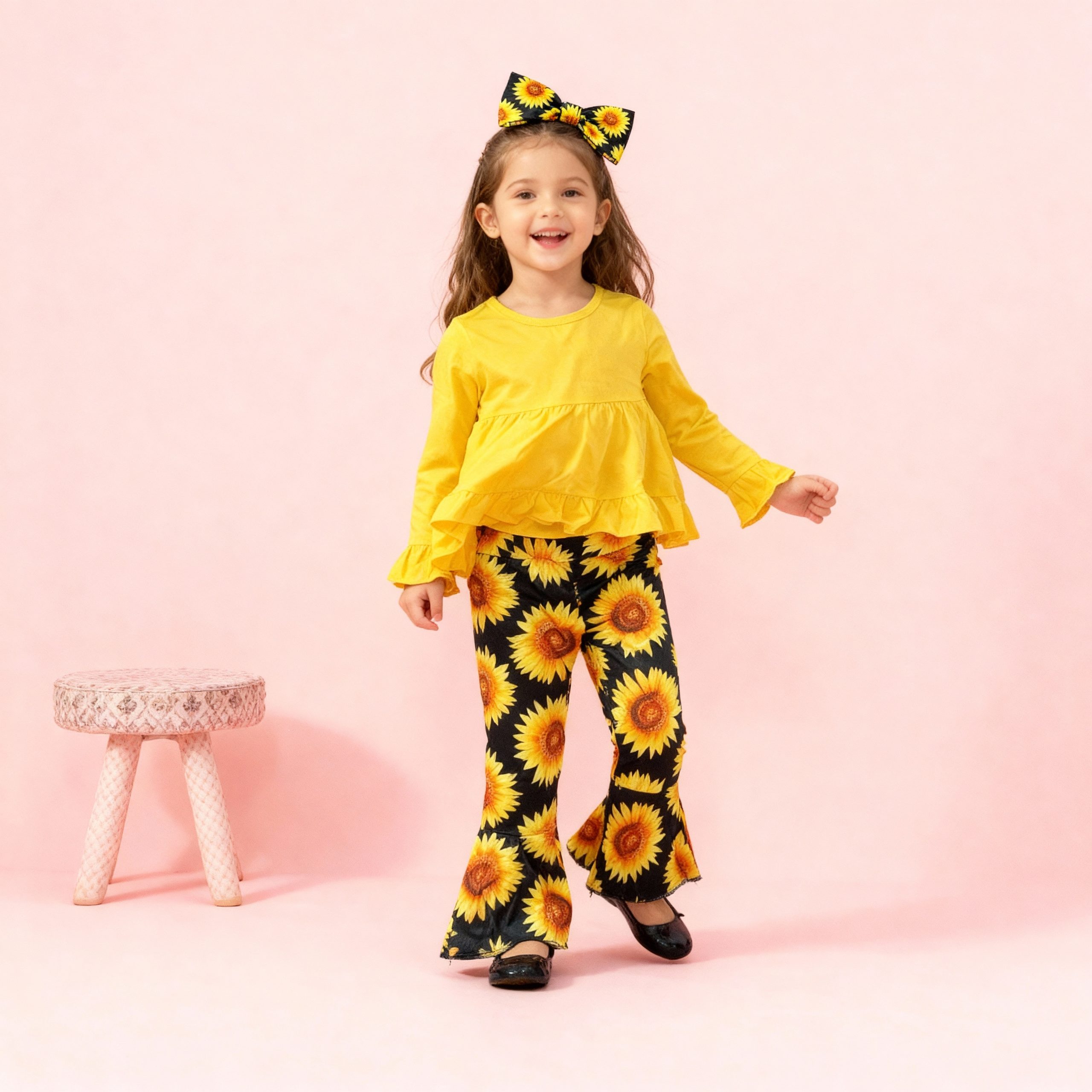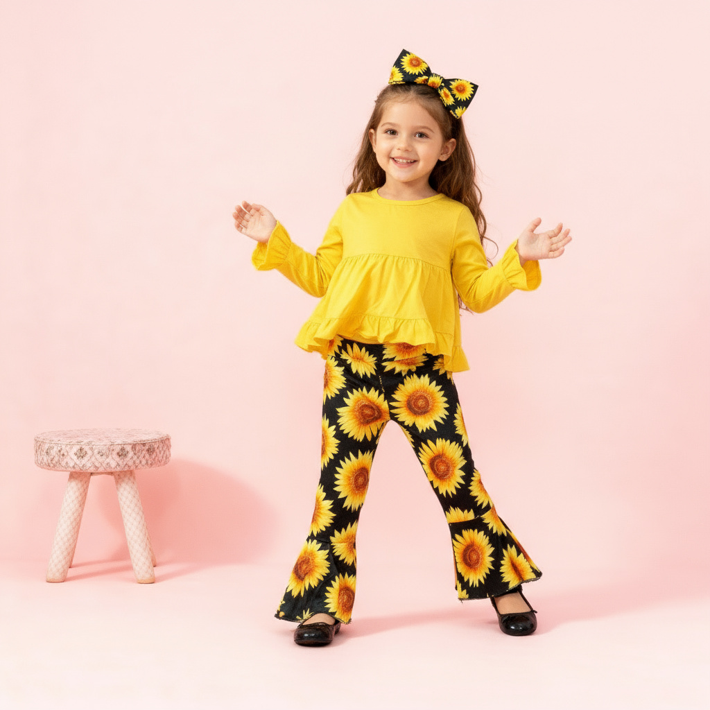 Bright yellow ruffle top + black sunflower print flare pants with matching tie. Cheerful, stylish, and perfect for spring or casual outings.