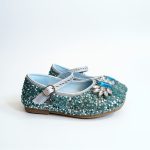 Shine bright with these dazzling Mary Janes. The entire upper is covered in sparkling teal glitter, finished with a large blue gemstone flower embellishment and silver velcro strap. Designed for girls who love princess vibes and photo-ready moments. Made from soft faux leather for comfort and durability. Wipe clean with damp cloth.