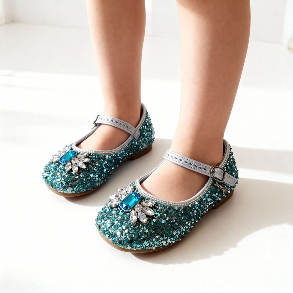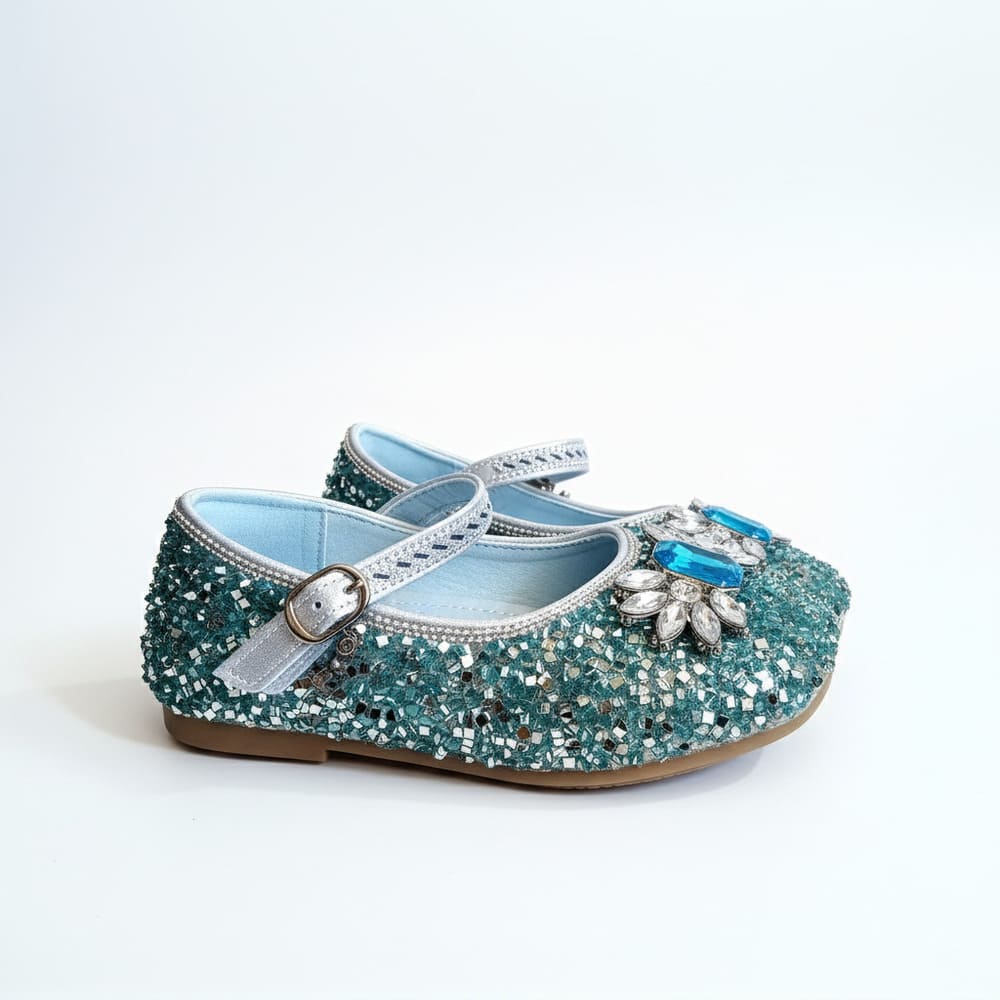 Sparkling teal glitter Mary Janes with large blue gemstone embellishment. Glamorous, festive, and perfect for parties or special events.