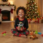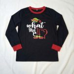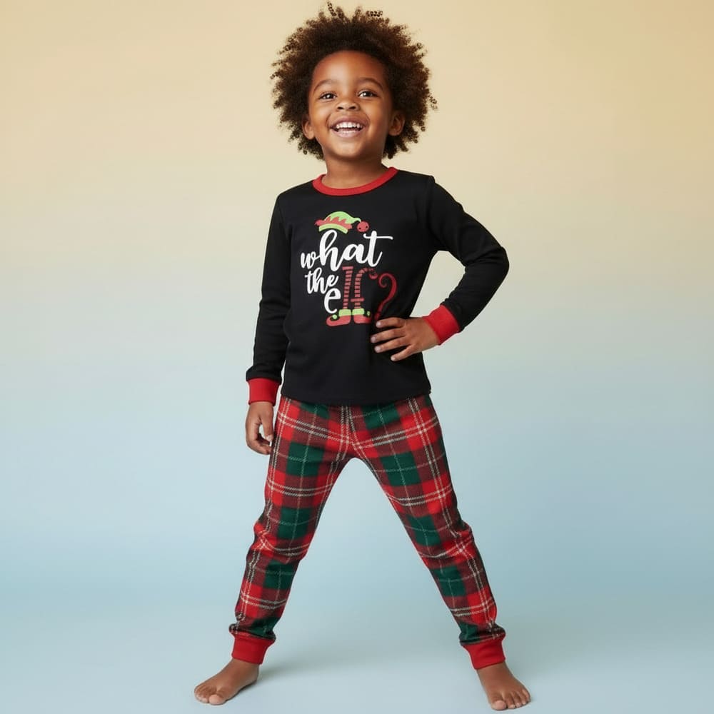 Black long-sleeve top with “what the elf?” print + red/green plaid pants. Playful, festive, and perfect for Christmas celebrations.