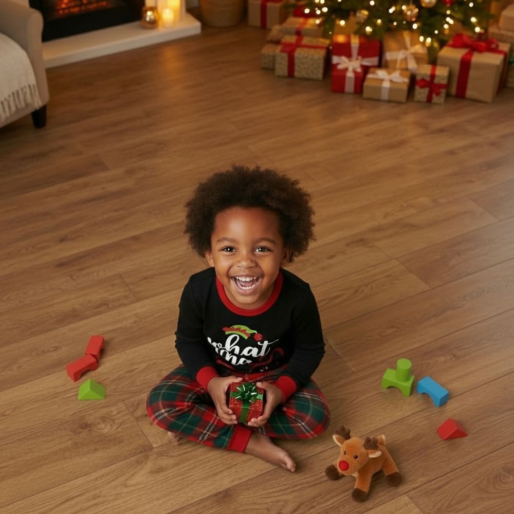 Add humor to the holidays with this cheeky set. The black top features a bold “what the elf?” script with elf feet and hat, while matching red-and-green plaid pants offer cozy comfort. Designed for kids who love fun prints and family gatherings. Made from soft cotton-blend fleece for all-day ease. Machine wash cold.