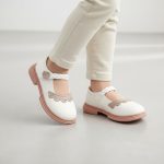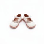Girl’s white Mary Jane shoes with braided strap and scalloped toe