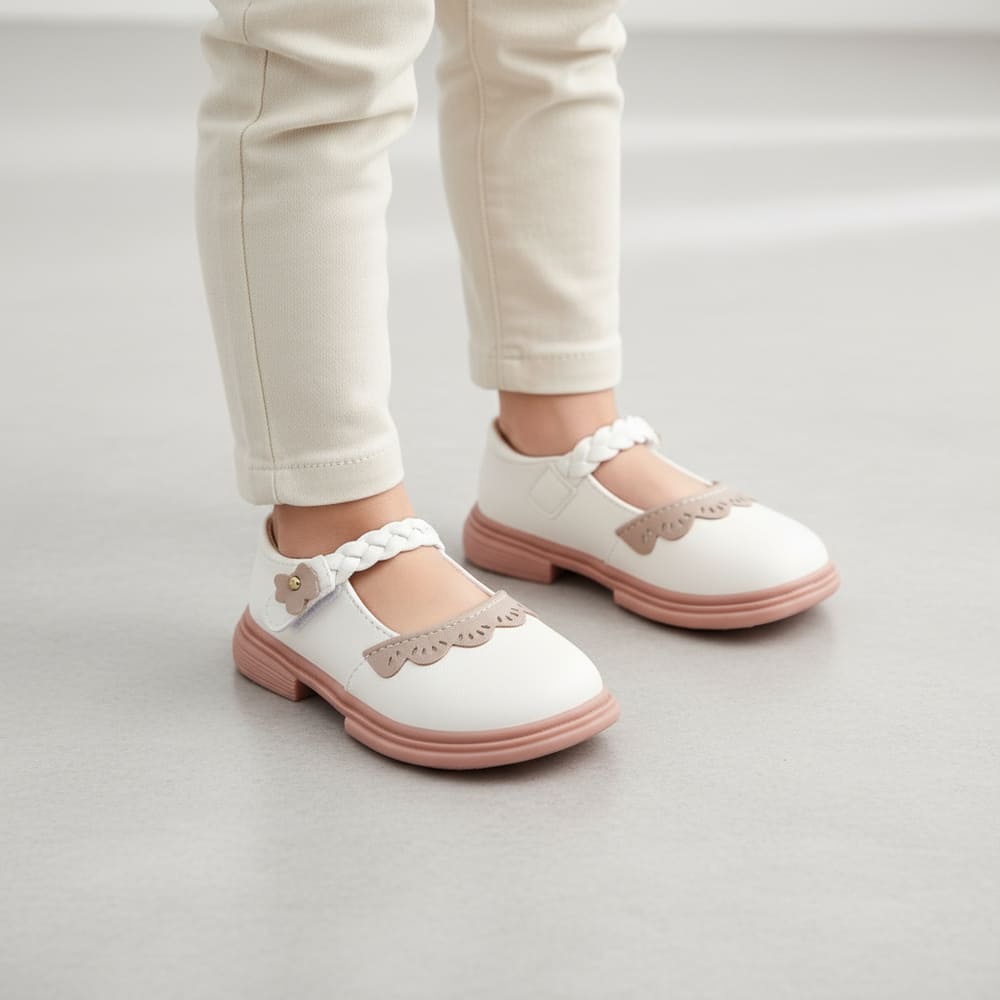 Bloom in beauty with these delicate Mary Janes. The soft white upper features a braided strap across the instep and a scalloped toe cap for a sweet, feminine finish. Designed for girls who love gentle textures and classic looks. Made from smooth faux leather for comfort and durability. Wipe clean with damp cloth.