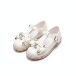 Step into sophistication with these glossy white Mary Janes. The sleek upper features a delicate bow adorned with pearls and rhinestones, creating a sweet, refined look. Designed for girls who love classic charm and polished style. Made from smooth faux leather for comfort and durability. Wipe clean with damp cloth.