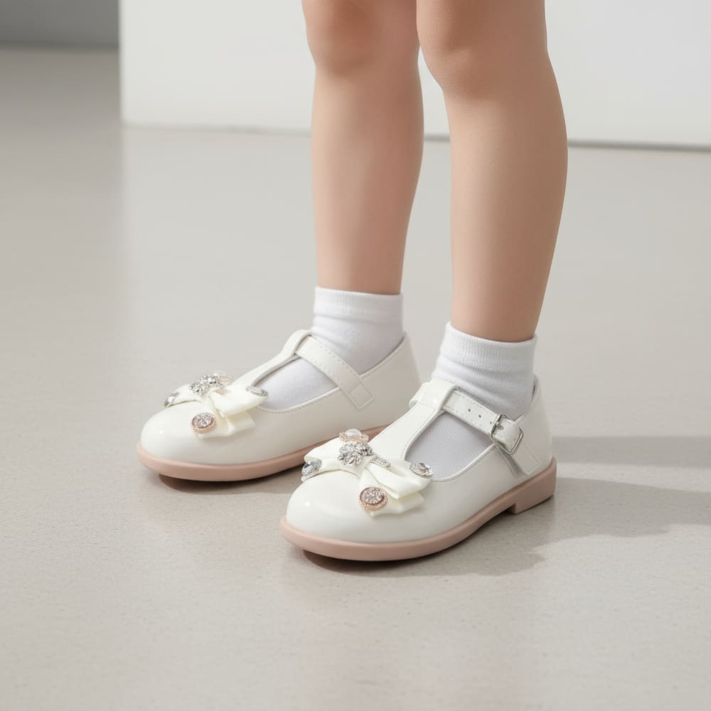 Glossy white Mary Janes with pearl-accented bow and rhinestone details. Sweet, elegant, and perfect for school or semi-formal events.