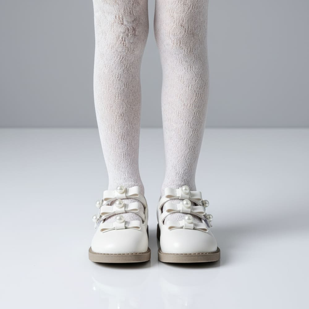 Classic Mary Jane silhouette in soft off-white with a triple-strap design across the instep, each strap accented by a delicate faux pearl at the center. Features a rounded toe, low-profile sole with decorative scalloped edge, and secure hook-and-loop closure—ideal for formal events or everyday elegance with a refined, feminine touch.