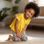 Girl wearing yellow ruffle top and leopard butterfly pants