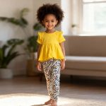 Bright yellow ruffle top + white leopard-print pants with butterfly motifs. Playful, bold, and perfect for trendy girls.