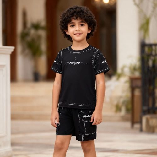 Boy wearing white hoodie with flame bear graphic and red flame pants